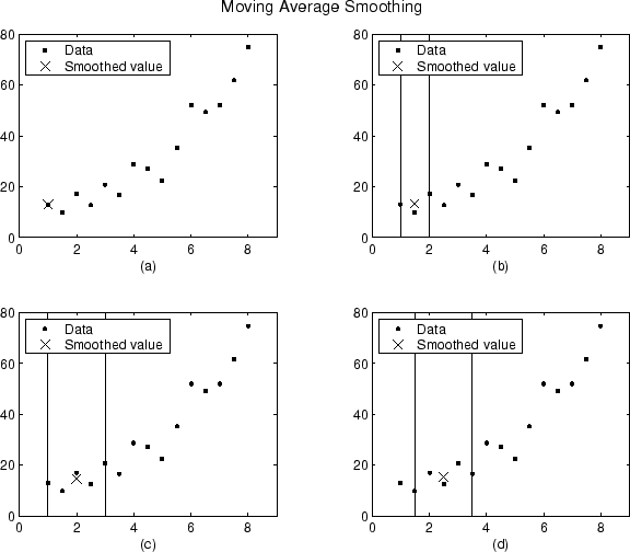 График (a) указывает, что первая точка данных не сглажена из-за невозможности построения диапазона. График (b) указывает, что вторая точка данных сглаживается с использованием диапазона из трех. Сюжеты (c) и (d) укажите, что для вычисления сглаженного значения используется диапазон из пяти.