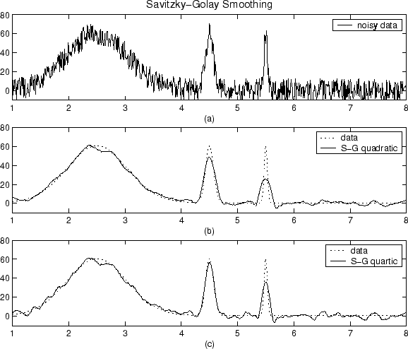 График (b) показывает результат сглаживания квадратичным полиномом. Обратите внимание, что метод работает плохо для узких пиков. График (c) показывает результат сглаживания с помощью квартирного полинома. В общем, многочлены более высокой степени могут более точно фиксировать высоты и ширины узких пиков, но могут плохо работать при сглаживании более широких пиков.