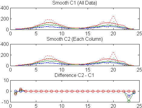 title('Smooth C2 (Each Column)')Постройте график разницы между двумя сглаженными наборами данных: