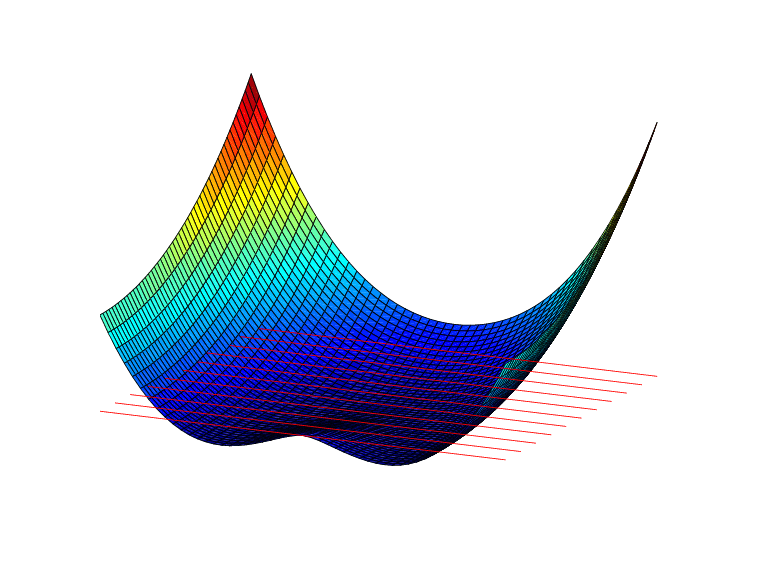 Полученный рисунок ниже показывает очень сильное изменение около начала координат. Это отражает тот факт, что там у вторых производных «,» есть логарифмическая сингулярность.