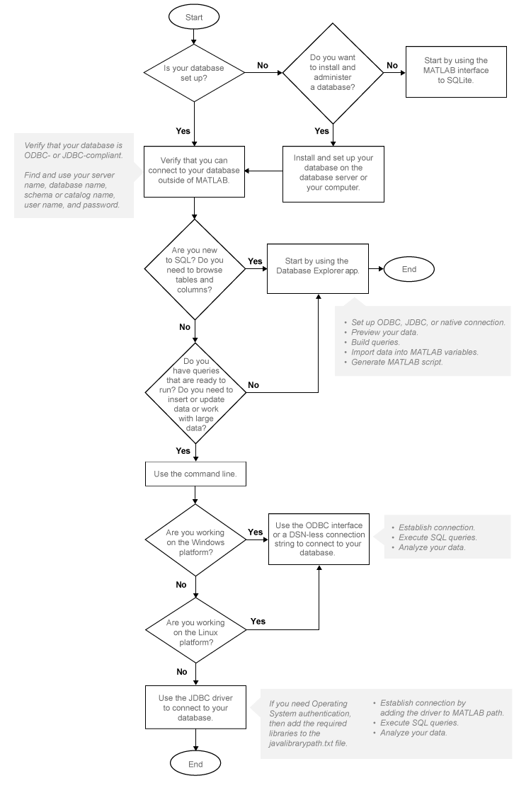 В этом учебном пособии показано, как использовать Toolbox™ базы данных с реляционными базами данных. Чтобы получить максимальную выгоду от этого набора инструментов и понять его возможности, используйте следующие шаги и блок-схему принятия решений.