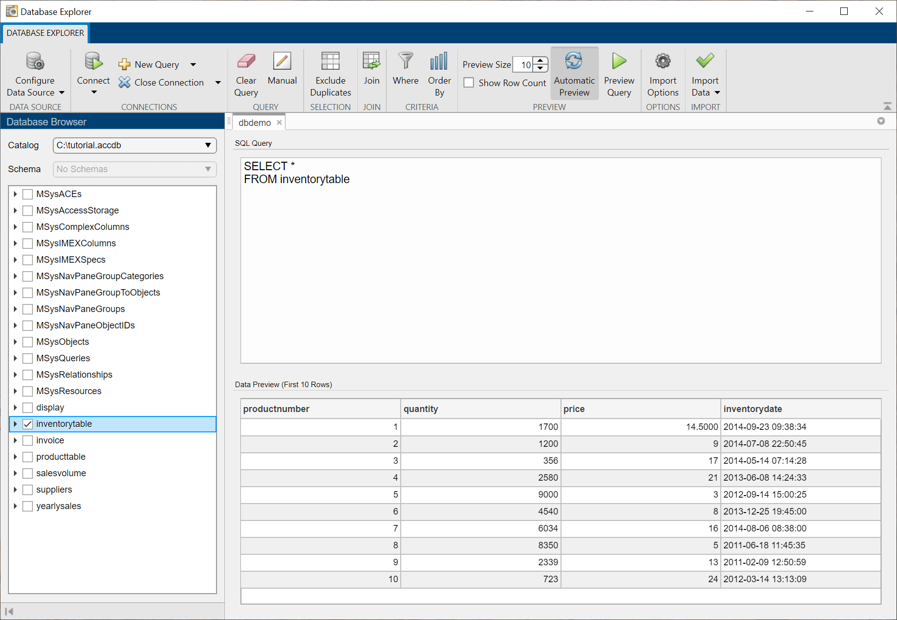 Щелкните таблицу на панели «Браузер данных». На панели SQL Query на вкладке источника данных отображается SQL-запрос, который выбирает все столбцы и строки таблицы. На панели Просмотр данных (Data Preview) отображается предварительный просмотр первых 10 строк данных в таблице. Например, подключитесь к базе данных Microsoft ® Access™ и выберите inventorytable таблица базы данных.