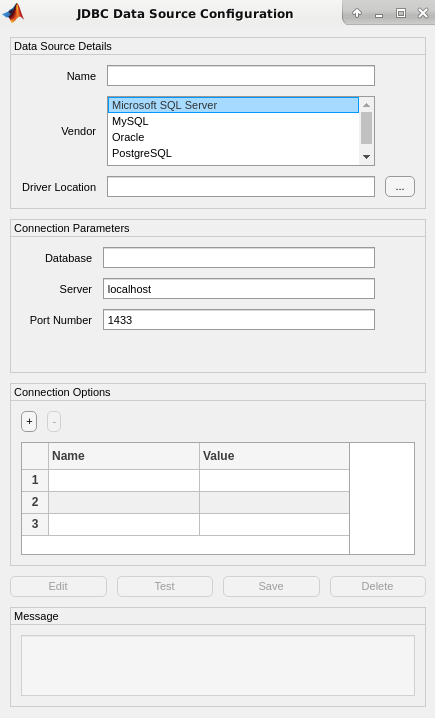 opts = setoptions(opts, ... 'DataSourceName',"MSSQLServer", ... 'JDBCDriverLocation',"/home/user/DB_Drivers/sqljdbc4.jar", ... 'DatabaseName',"toystore_doc",'Server',"dbtb04", ... 'PortNumber',54317);