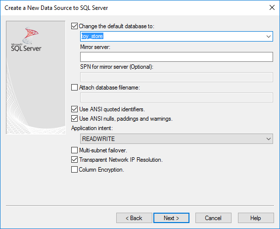 В диалоговом окне Создание нового источника данных для SQL Server выберите Изменить базу данных по умолчанию на и введите имя базы данных по умолчанию на сервере базы данных для подключения. Здесь используйте базу данных toy_store. Затем нажмите кнопку Далее.