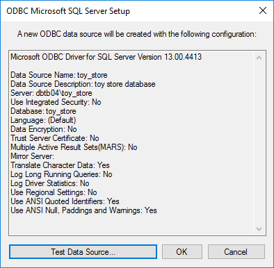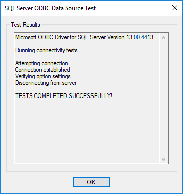 При успешном подключении открывается диалоговое окно Проверка источника данных ODBC SQL Server, в котором отображается сообщение об успешном завершении тестов. Нажмите кнопку ОК, чтобы закрыть это диалоговое окно. Нажмите кнопку ОК, чтобы закрыть диалоговое окно установки ODBC Microsoft SQL Server.