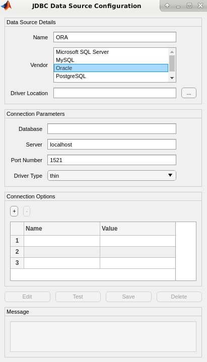 opts = setoptions(opts, ... 'DataSourceName',"ORA", ... 'JDBCDriverLocation',"/home/user/DB_Drivers/ojdbc7.jar", ... 'DatabaseName',"toystore_doc",'Server',"dbtb05", ... 'PortNumber',1521,'DriverType',"oci");