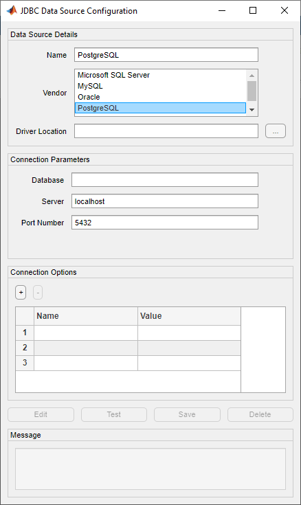 vendor = "PostgreSQL"; opts = databaseConnectionOptions("jdbc",vendor);