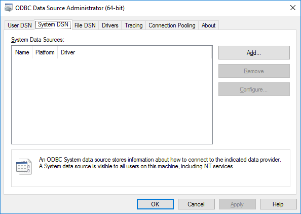 Перейдите на вкладку System DSN и нажмите кнопку Add.