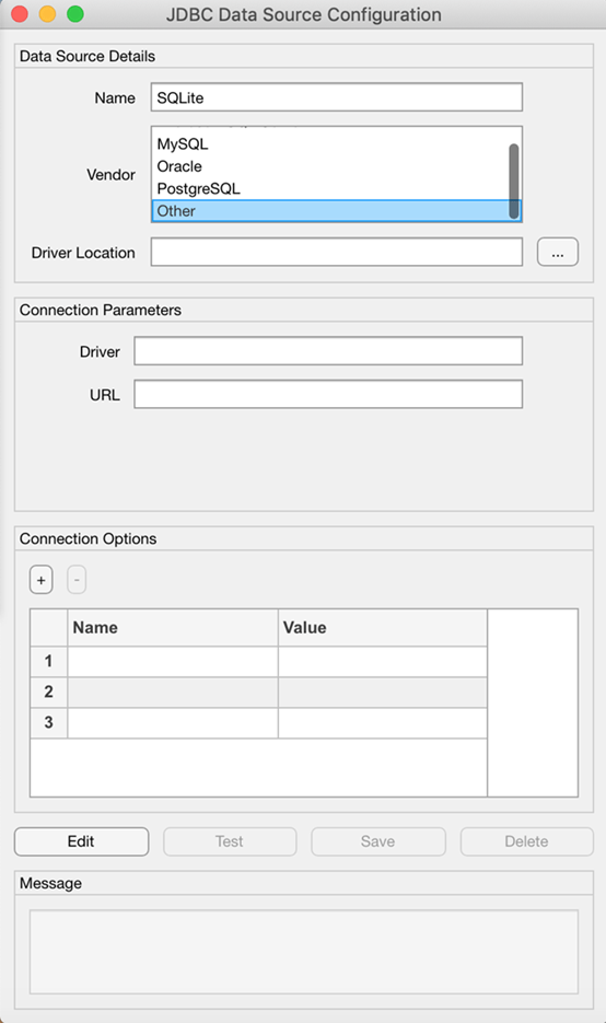 В поле Драйвер введите объект класса Java ® драйвера SQLite. Здесь используйтеorg.sqlite.JDBC.