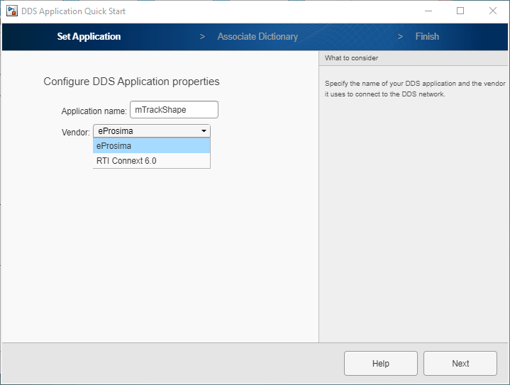 Укажите имя приложения DDS и поставщика. Оставьте имя приложения в качестве имени по умолчанию, которое является именем модели приложения, shapesdemo. Выберите поставщика DDS, который будет использоваться для приложения. В этом примере выберите eProsima.