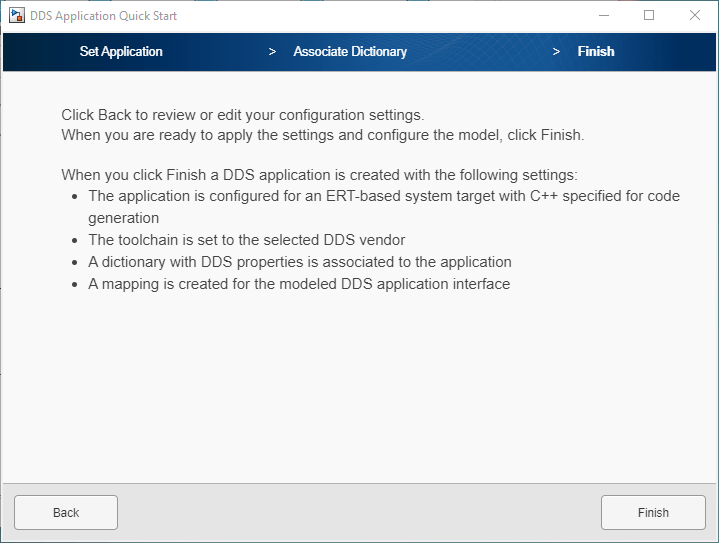 Чтобы завершить переход от DDS к Simulink, нажмите кнопку Готово. После завершения быстрого запуска приложения DDS приложение создает приложение DDS, связывает его со словарем DDS и настраивает его соответствующим образом для eProsima.