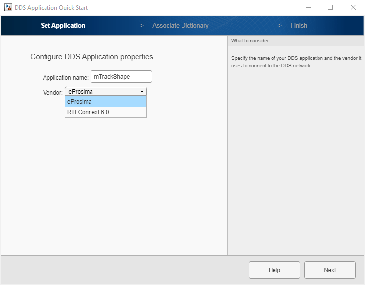 Чтобы указать поставщика DDS (и задать цепочку инструментов), в раскрывающемся списке Поставщик выберите RTI или eProsima. Если создание кода не планируется, выбор поставщика не влияет на моделирование, поэтому можно принять поставщика по умолчанию.