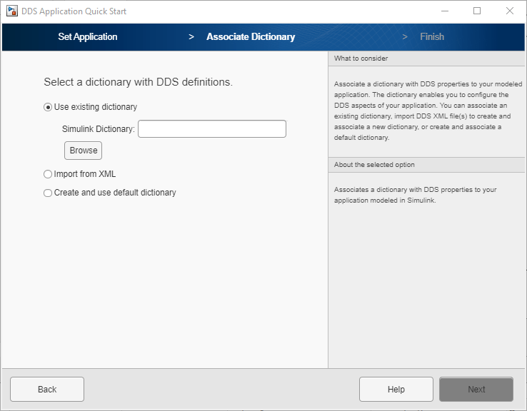 На второй странице быстрого запуска приложения DDS укажите источник определений DDS для приложения. Определения DDS, созданные или импортированные, хранятся в разделе словаря данных Simulink, называемом DDS Dictionary. Можно создать и связать словарь DDS с приложением, используя один из следующих вариантов: