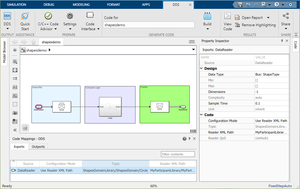 Режим конфигурации Тема и QoS обеспечивает упрощенный, быстрый и интуитивно понятный способ настройки интерфейса DDS, который не требует предшествующей XML-спецификации DataReaders и DataWriters. Редактор сопоставлений кода можно использовать для выбора разделов приложения, а блок DDS создает необходимые DataReaders и DataWriters для подключения к сети DDS. Если требуется задать QoS для созданных устройств чтения и записи, можно использовать инспектор свойств для выбора профиля QoS.