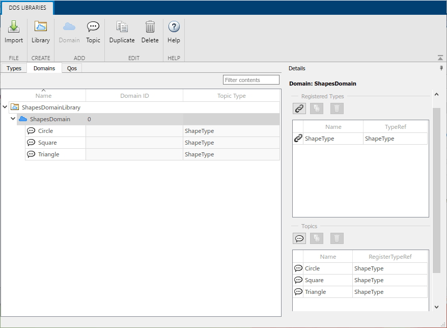 Чтобы открыть DDS-словарь для настройки доменов, тем и зарегистрированных типов, на панели инструментов DDS Blockset щелкните Интерфейс кода и выберите DDS-словарь. В словаре DDS перейдите на вкладку Домены.