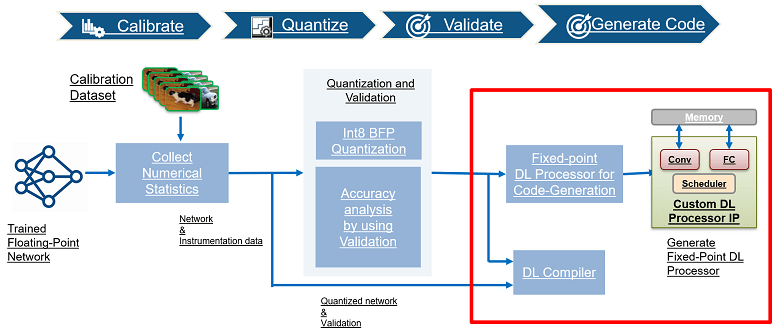 После калибровки предварительно обученной последовательной сети путем сбора данных КИП квантуйте последовательную сеть и проверьте точность квантованной сети. Как только квантованная сеть подтверждена, генерируйте код для и развертывайте квантованную сеть.