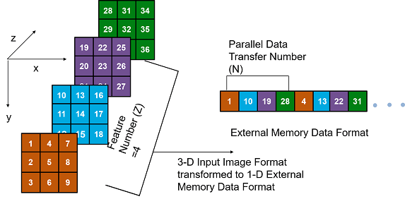 Входы и выходы модуля свертки процессора глубокого обучения обычно являются трехмерными (3-D). Внешняя память хранит данные в одномерном (1-D) векторе. Преобразование 3-D входного изображения во 1-D для сохранения во внешней памяти:
