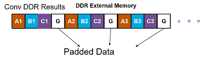 На рисунке показан пример формата выходных данных внешней памяти для входной матрицы после заполнения нулем. В изображении A, B и C являются тремя признаками входного изображения, а G - заполненными нулями данными для создания входного изображения. Z значение четыре, которое кратно N.
