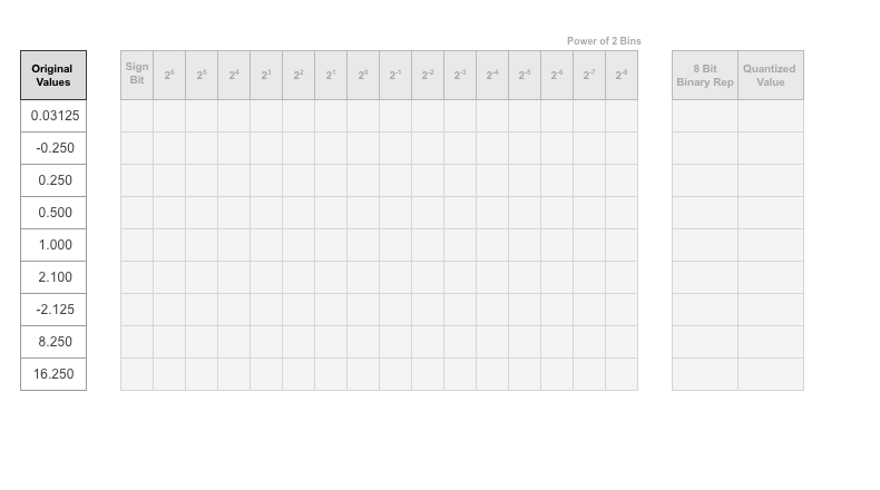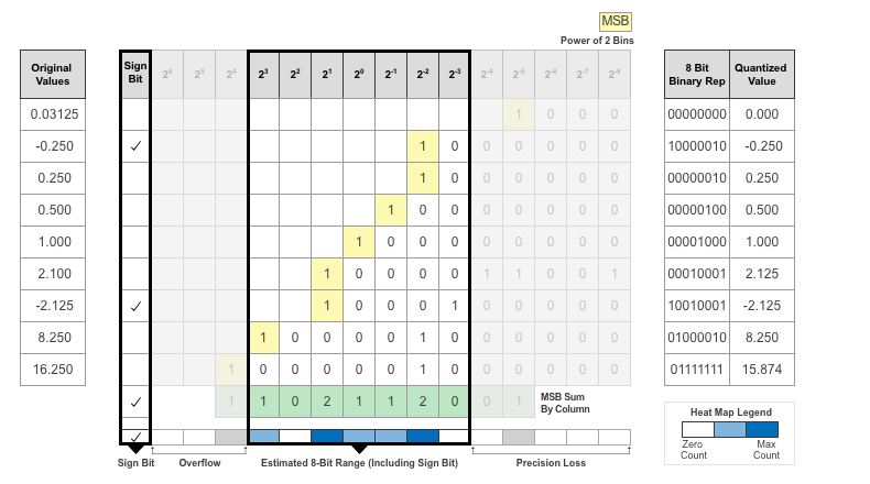 В этом примере значение 0,03125 страдает от недостаточного потока, поэтому квантованное значение равно 0. Значение 2.1 имеет некоторую потерю точности, поэтому квантованное значение равно 2,125. Значение 16.250 больше, чем наибольшее представимое значение типа данных, поэтому это значение переполняется, и квантованное значение насыщается до 15.874.