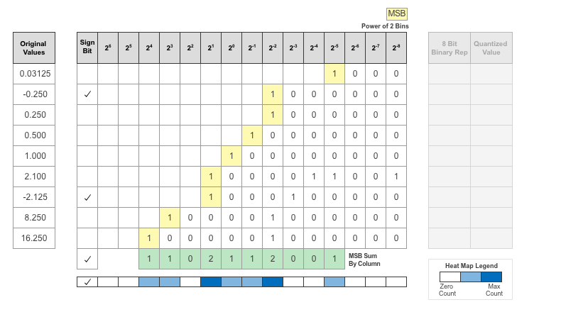 Выравнивая двоичные слова, можно увидеть распределение битов, используемых записанными значениями параметра. Сумма MSB в каждом столбце, выделенная зеленым цветом, дает совокупное представление зарегистрированных значений.