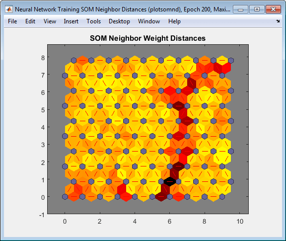 Поскольку этот SOM имеет двухмерную топологию, можно визуализировать в двух измерениях взаимосвязи между четырехмерными центрами кластера. Одним из инструментов визуализации для SOM является матрица весовых расстояний (также называемая U-матрицей).