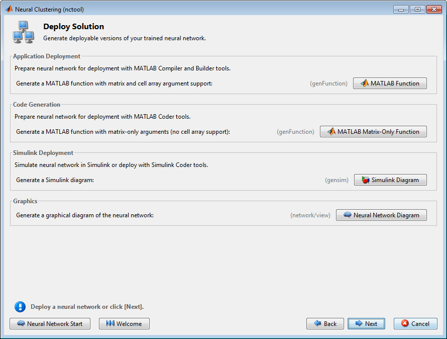 Эта панель используется для создания функции MATLAB или диаграммы Simulink для моделирования нейронной сети. Можно использовать сгенерированный код или диаграмму, чтобы лучше понять, как нейронная сеть вычисляет выходные данные из входных данных, или развернуть сеть с помощью инструментов компилятора MATLAB и других инструментов генерации кода MATLAB и Simulink.