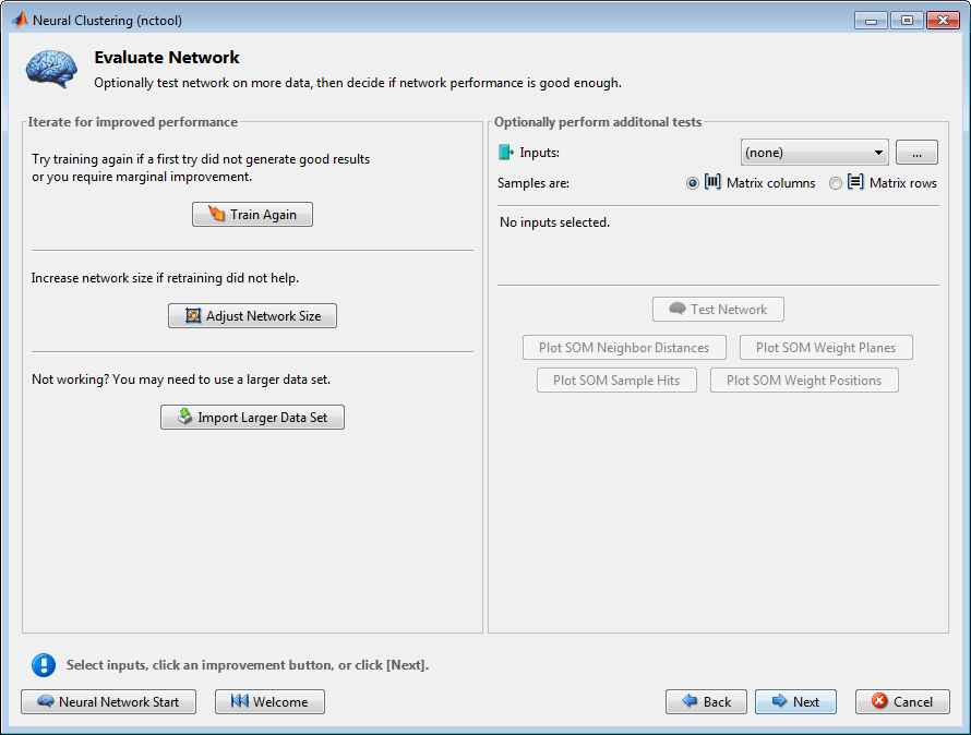 В приложении Neural Network Clustering App нажмите кнопку Далее, чтобы оценить сеть.