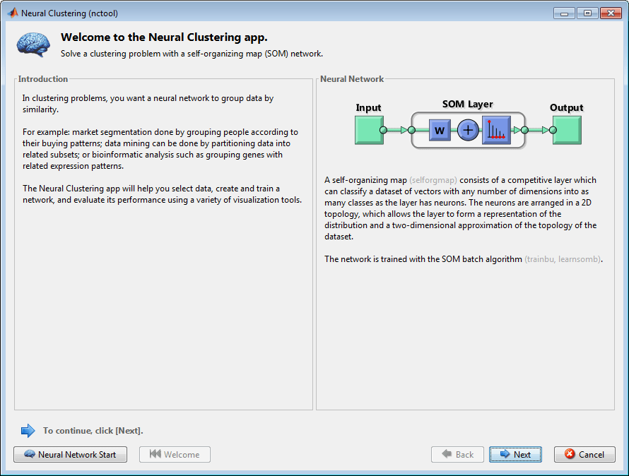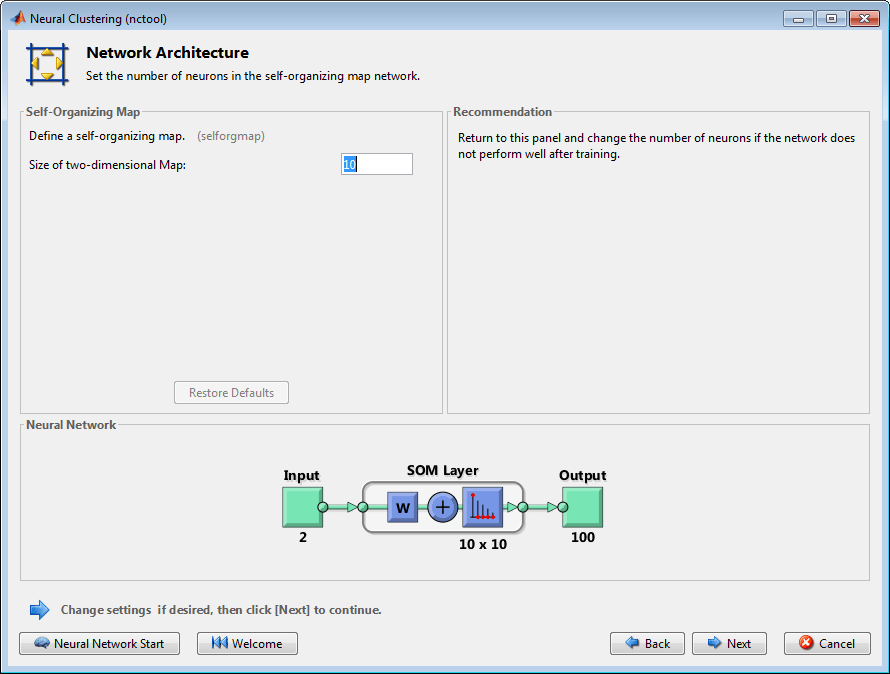 Для проблем кластеризации наиболее часто используемой сетью является самоорганизующаяся карта функций (SOM), поскольку после обучения сети существует множество инструментов визуализации, которые можно использовать для анализа результирующих кластеров. Эта сеть имеет один слой, с нейронами, организованными в сетку. (Дополнительные сведения о SOM см. в разделе «Самоорганизующиеся карты элементов».) При создании сети указывается количество строк и столбцов в сетке. Здесь количество строк и столбцов устанавливается равным 10. Общее количество нейронов - 100. При необходимости можно изменить этот номер в другом прогоне.