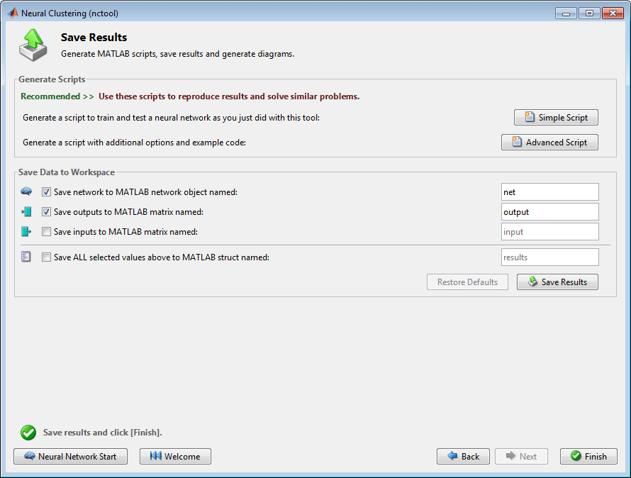 Можно также сохранить сеть как net в рабочей области. На нем можно выполнить дополнительные тесты или поставить его для работы на новых входах.