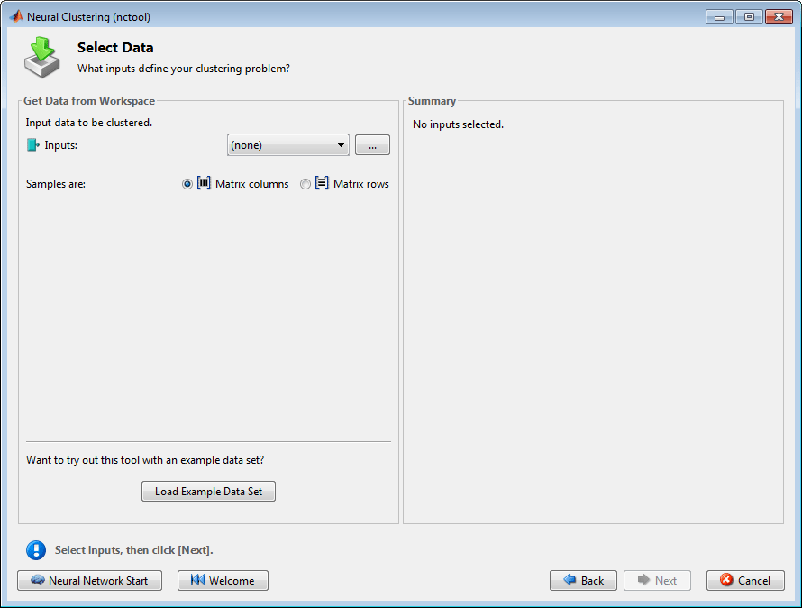 Откройте приложение Neural Network Clustering с помощью nctool.