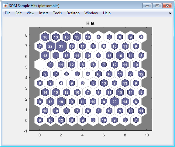 Топология SOM по умолчанию - шестиугольная. На этом рисунке показаны местоположения нейронов в топологии и указано, сколько обучающих данных связано с каждым из нейронов (центров кластеров). Топология представляет собой сетку 10 на 10, поэтому существует 100 нейронов. Максимальное количество попаданий, связанных с любым нейроном, составляет 31. Таким образом, в этом кластере имеется 31 входной вектор.