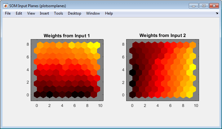 На этом рисунке показана весовая плоскость для каждого элемента входного вектора (в данном случае два). Они представляют собой визуализации весов, которые соединяют каждый вход с каждым из нейронов. (Более темные цвета представляют большие веса.) Если шаблоны соединений двух входов были очень похожи, можно предположить, что входы сильно коррелированы. В этом случае вход 1 имеет соединения, которые сильно отличаются от соединений входа 2.