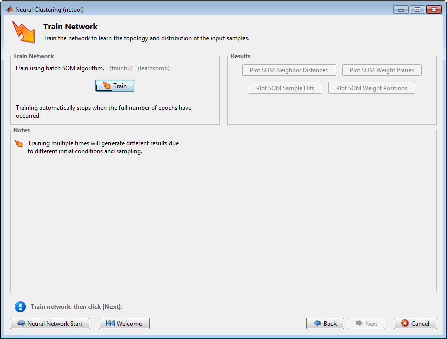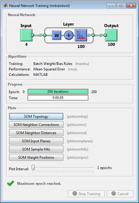Обучение сети. Сеть SOM использует алгоритм SOM пакета по умолчанию для обучения.