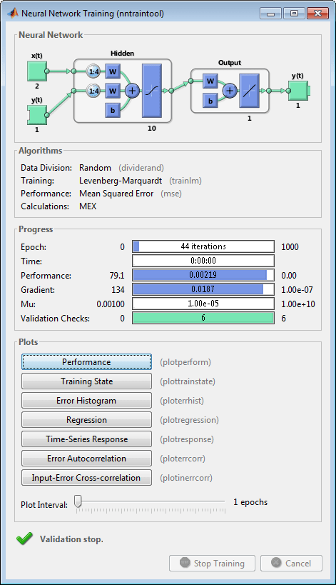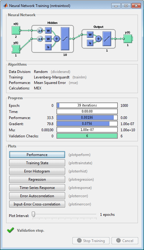 Все обучение выполняется в открытом цикле (также называемом последовательно-параллельной архитектурой), включая этапы проверки и тестирования. Типичный рабочий процесс состоит в том, чтобы полностью создать сеть в разомкнутом цикле, и только после обучения (которое включает в себя этапы проверки и тестирования) она преобразуется в замкнутый цикл для многоступенчатого прогнозирования. Аналогично, R значения в GUI вычисляются на основе результатов обучения с разомкнутым контуром.