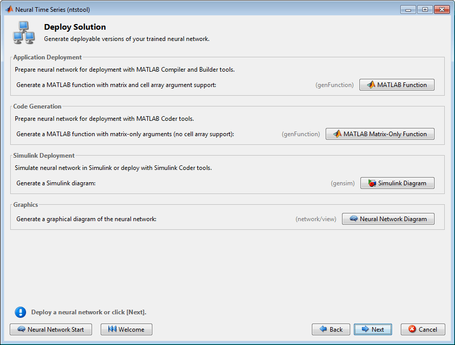 Эта панель используется для создания функции MATLAB или диаграммы Simulink ® для моделирования нейронной сети. Можно использовать сгенерированный код или диаграмму, чтобы лучше понять, как нейронная сеть вычисляет выходные данные на основе входных данных, или развернуть сеть с помощью инструментов MATLAB Compiler™ и других инструментов генерации кода MATLAB и Simulink.