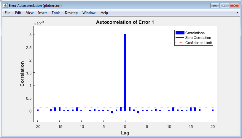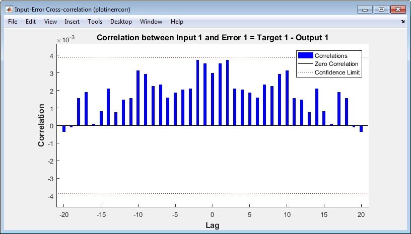 Эта функция взаимной корреляции «входная ошибка» иллюстрирует, как ошибки коррелируются с входной последовательностью x (t). Для идеальной модели прогнозирования все корреляции должны быть равны нулю. Если входной сигнал коррелирует с ошибкой, то должна быть возможность улучшить предсказание, возможно, за счет увеличения числа задержек в отводимых линиях задержки. В этом случае все корреляции находятся в пределах доверительных границ вокруг нуля.