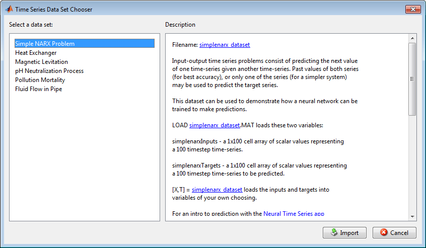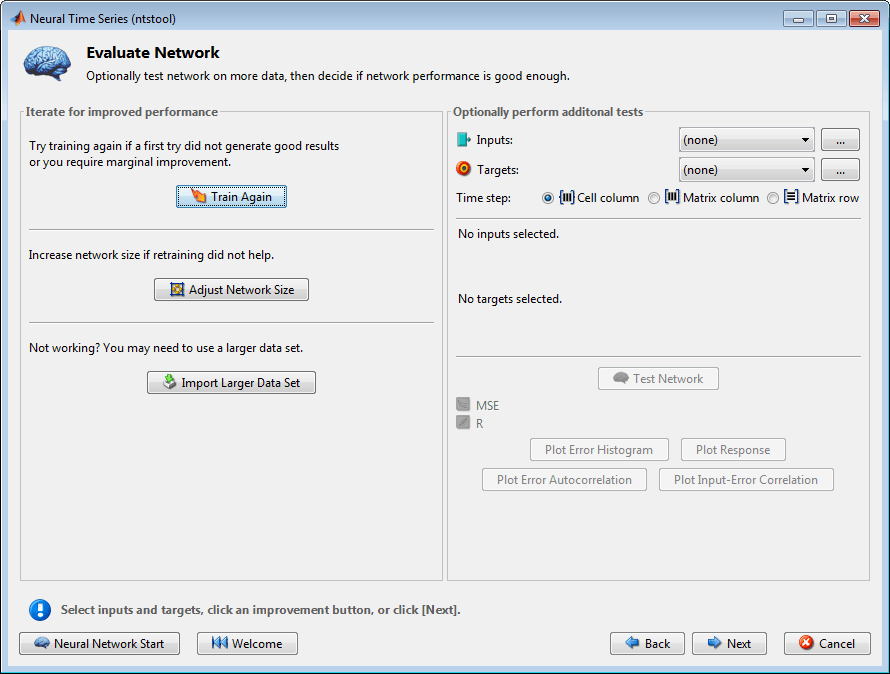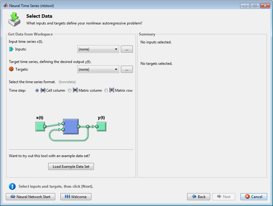 Если требуется загрузить данные из рабочей области MATLAB ®, используйте опции Входы и цели (Inputs and Targets) в окне Выбрать данные (Select Data).