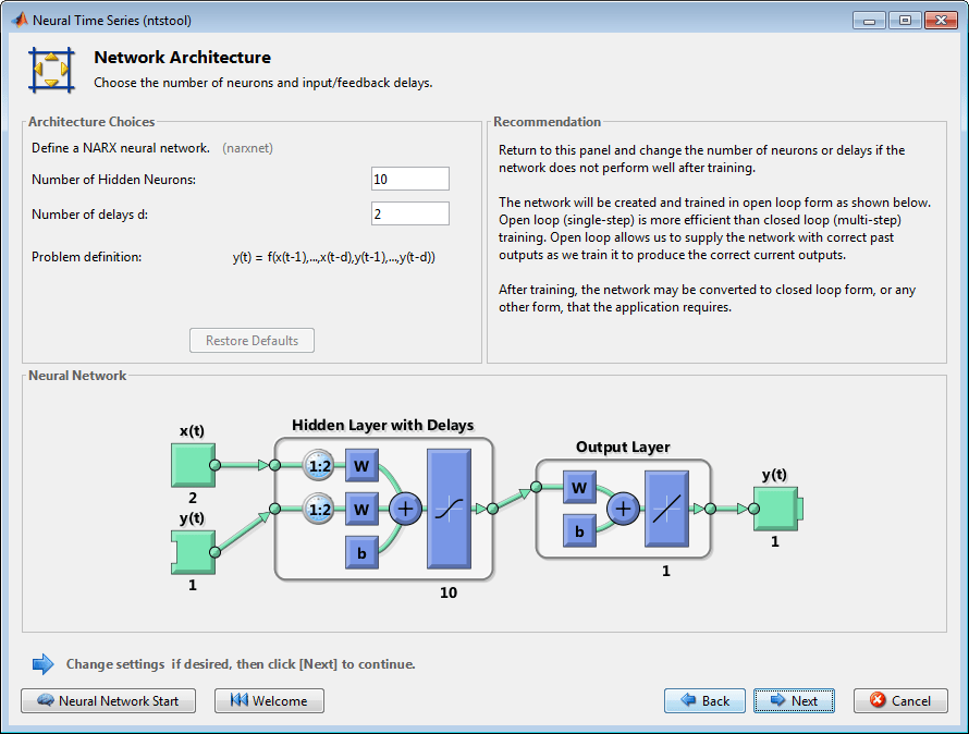 Количество скрытых нейронов по умолчанию равно 10. По умолчанию количество задержек равно 2. Измените это значение на 4. Вы можете изменить эти цифры, если производительность обучения в сети плохая.