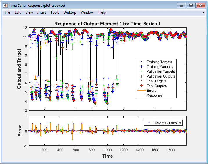 В разделе Графики (Plots) щелкните Ответ временного ряда (Time Series Response). Здесь отображаются входные данные, цели и ошибки в зависимости от времени. Он также указывает, какие моменты времени были выбраны для обучения, тестирования и проверки.