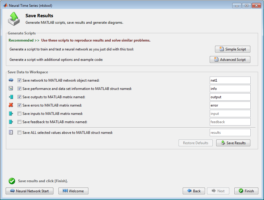 Можно также сохранить сеть как net в рабочей области. На нем можно выполнить дополнительные тесты или поставить его для работы на новых входах.