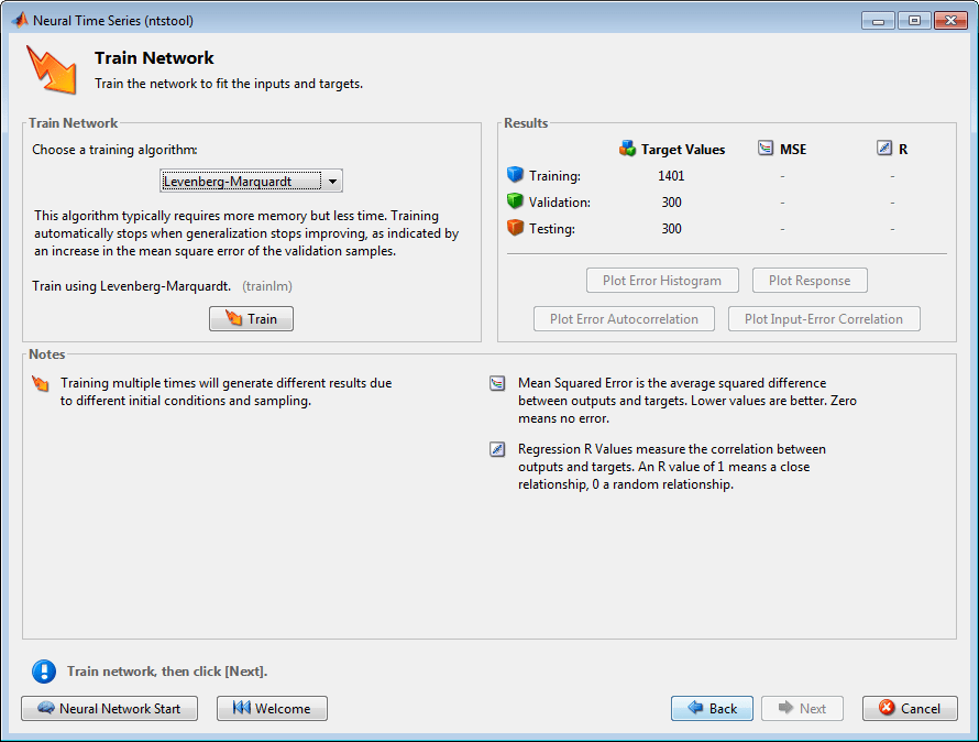Выберите алгоритм обучения и нажмите Train. Левенберг-Марквардт (trainlm) рекомендуется для большинства проблем, но для некоторых шумных и небольших проблем байесовская регуляризация (trainbr) может занять больше времени, но получить лучшее решение. Однако для больших проблем масштабированный сопряженный градиент (trainscg) рекомендуется, поскольку он использует градиентные вычисления, которые эффективнее памяти, чем якобинские вычисления, используемые двумя другими алгоритмами. В этом примере используется значение по умолчанию Levenberg-Marquardt.