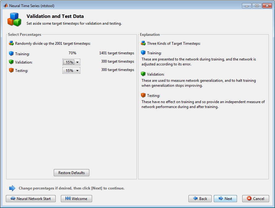 net.divideParam.trainRatio = 70/100; net.divideParam.valRatio = 15/100; net.divideParam.testRatio = 15/100;