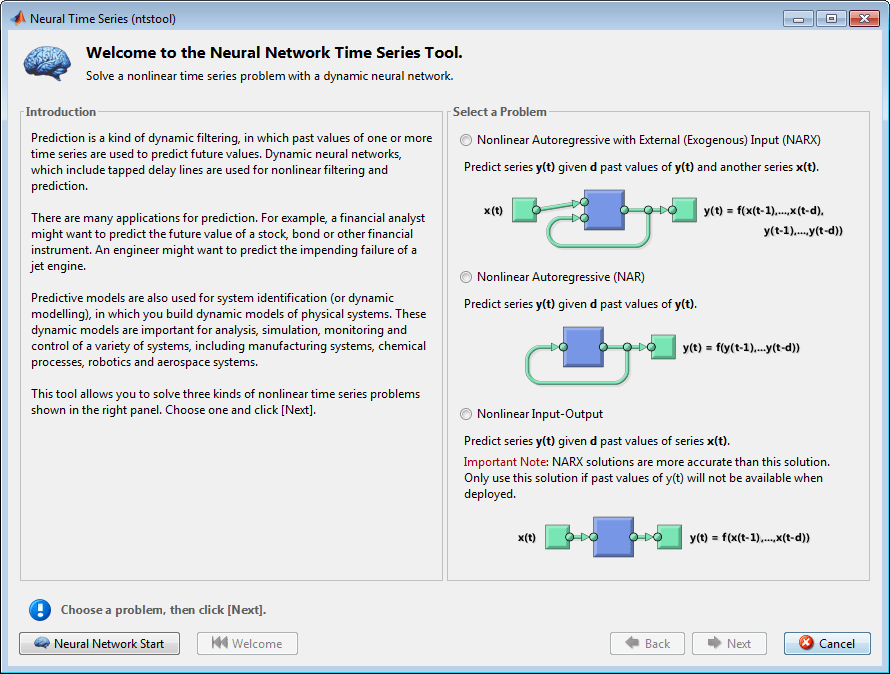 В первом типе проблемы временного ряда необходимо предсказать будущие значения временного ряда y (t) из прошлых значений этого временного ряда и прошлых значений второго временного ряда x (t). Эта форма предсказания называется нелинейной авторегрессией с экзогенным (внешним) входом, или NARX (см. «NARX Network» (narxnet, closeloop)), и может быть записана следующим образом: