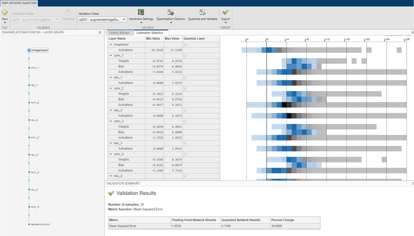 После квантования приложение использует набор проверочных данных для проверки сети, чтобы понять влияние ограниченного диапазона и точности квантованных обучаемых параметров слоев свертки в сети.