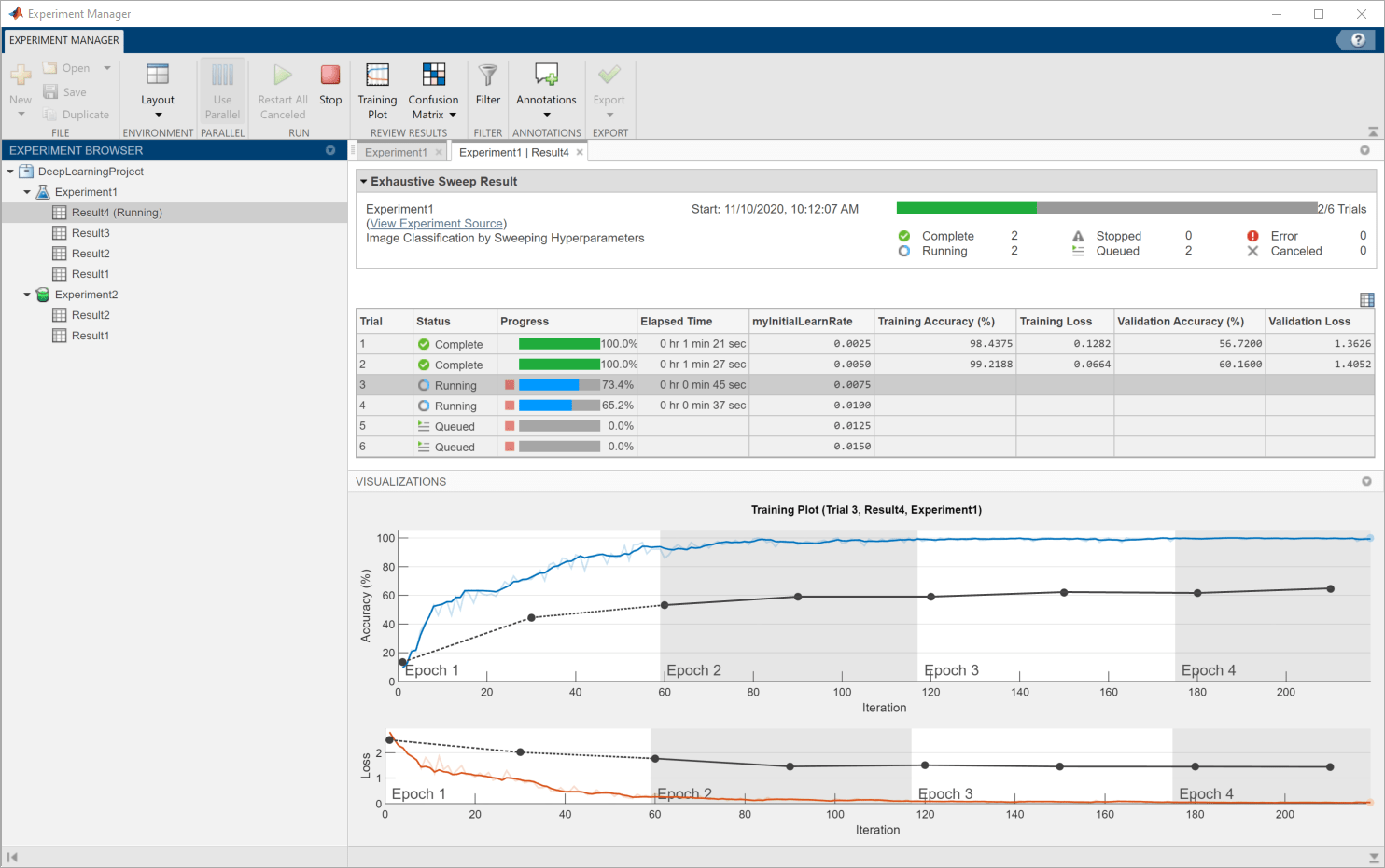 При выполнении эксперимента Диспетчер экспериментов обучает сеть, определенную функцией обучения, шесть раз. В каждом испытании используется один из показателей обучения, указанных в таблице гиперпараметров. По умолчанию Experiment Manager запускает по одной пробной версии. При наличии панели инструментов Parallel Computing Toolbox можно выполнять несколько пробных версий одновременно. Чтобы получить наилучшие результаты, перед запуском эксперимента запустите параллельный пул с таким количеством работников, как GPU. Дополнительные сведения см. в разделе Использование диспетчера экспериментов для обучения сетей параллельной поддержке и поддержке графического процессора по выпуску (панель инструментов параллельных вычислений).