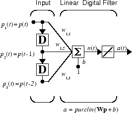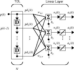 Для полного использования сети ADALINE необходим новый компонент - линия задержки с отводом. Такая линия задержки показана на следующем рисунке. Входной сигнал поступает слева и проходит через N-1 задержки. Выходной сигнал линии задержки с отводом (TDL) представляет собой N-мерный вектор, состоящий из входного сигнала в текущий момент времени, предыдущего входного сигнала и т.д.