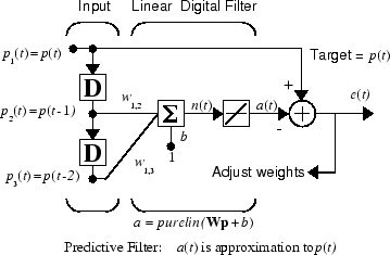 Прогнозируемый сигнал p (t) поступает слева в отводимую линию задержки. Предыдущие два значения p (t) доступны в качестве выходных сигналов линии задержки с отводом. Сеть используетadapt изменить веса на каждом временном шаге, чтобы минимизировать ошибку e (t) справа. Если эта ошибка равна 0, сетевой выход a (t) точно равен p (t), и сеть правильно сделала свой прогноз.
