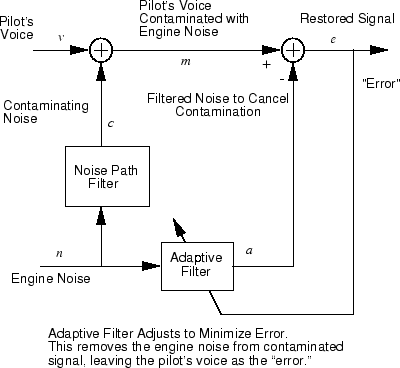 Рассмотрим пилота в самолете. Когда пилот говорит в микрофон, шум двигателя в кабине сочетается с голосовым сигналом. Этот дополнительный шум делает результирующий сигнал услышанным пассажирами низкого качества. Целью является получение сигнала, который содержит голос пилота, но не шум двигателя. Можно отменить шум адаптивным фильтром, если получить образец шума двигателя и применить его в качестве входного сигнала адаптивного фильтра.