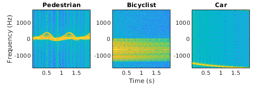oldpath = addpath(fullfile(matlabroot,'examples','phased','main')); numPed = 1; % Number of pedestrian realizations numBic = 1; % Number of bicyclist realizations numCar = 1; % Number of car realizations [xPedRec,xBicRec,xCarRec,Tsamp] = helperBackScatterSignals(numPed,numBic,numCar); [SPed,T,F] = helperDopplerSignatures(xPedRec,Tsamp); [SBic,~,~] = helperDopplerSignatures(xBicRec,Tsamp); [SCar,~,~] = helperDopplerSignatures(xCarRec,Tsamp); Пример обработки этих данных для глубокого обучения см. в разделе Классификация пешеходов и велосипедистов с использованием глубокого обучения. Для восстановления пути используйте path(oldpath); | Классификация «последовательность-метка» |