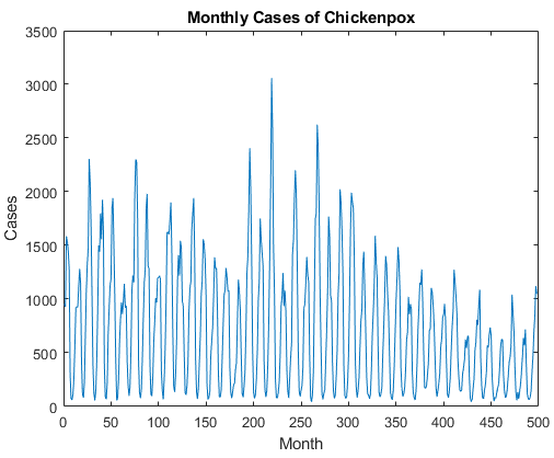 | Набор данных ветряной оспы содержит один временной ряд с временными шагами, соответствующими месяцам, и значениями, соответствующими количеству случаев. Выходные данные представляют собой массив ячеек, где каждый элемент представляет собой один временной шаг. Загрузите данные ветряной оспы как одну числовую последовательность, используя data = chickenpox_dataset;